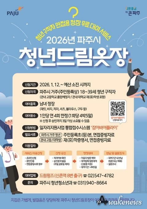 어웨이크뉴스 오경하 기자 | 파주시는 관내 청년 구직자에게 면접용 정장을 무료로 대여해 주는 녪년 청년드림옷장’사업을 12일부터 재개한다고 밝혔다.
