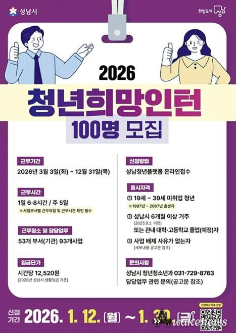 어웨이크뉴스 오경하 기자 | 성남시는 오는 1월 30일까지 ‘청년 희망 인턴 사업’ 참여자 100명을 모집한다.
