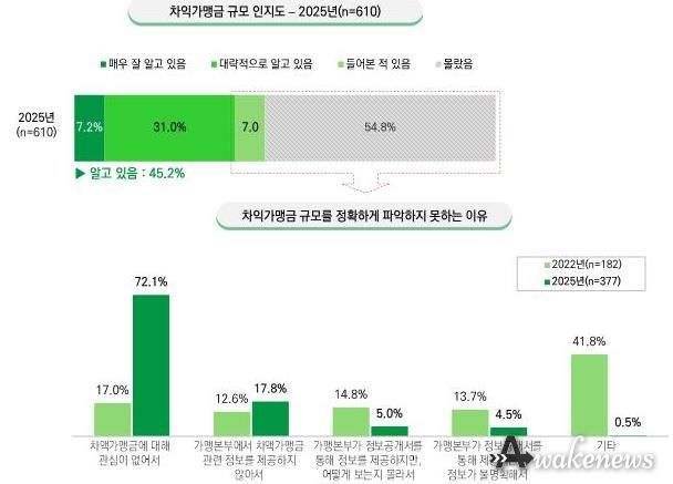 가맹본부의 53%가 차액가맹금이 존재한다고 응답했으며, 평균 금액은 연간 224만 원으로 조사됐다. 가맹점주를 대상으로 한 조사에서 차액가맹금의 규모를 알고 있는 응답자는 45.2%에 불과했으며, 정확하게 파악하지 못하는 이유에 대해 차액가맹금에 대한 무관심이 72.1%로 가장 높게 나타났다.