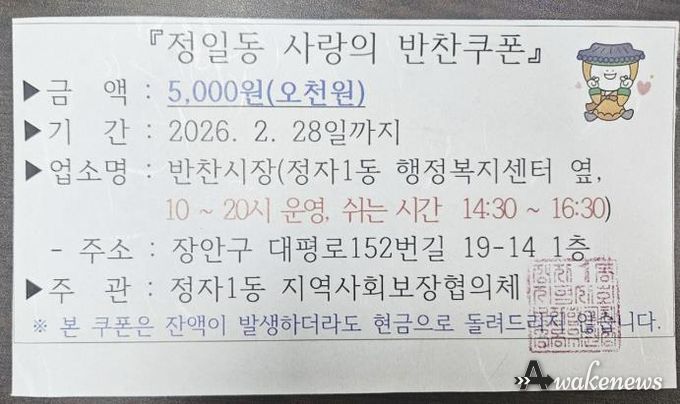 어웨이크뉴스 오경하 기자 | 수원시 장안구 정자1동 지역사회보장협의체는 금년부터 관내 취약계층 가구를 대상으로 매월 5가구에 2만원 상당의 반찬쿠폰을 지급하는 사업을 시작한다고 지난 13일 밝혔다.