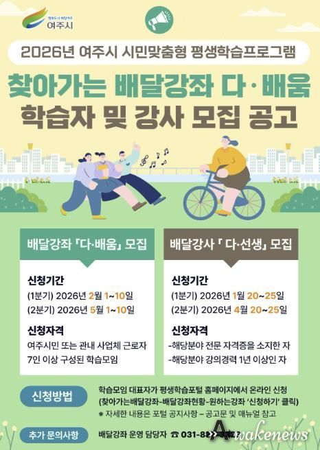 어웨이크뉴스 오경하 기자 | 여주시는 시민 누구나 원하는 시간과 장소에서 배움을 이어갈 수 있도록 지원하는 2026년 시민 맞춤형 평생학습 프로그램 ‘찾아가는 배달강좌’의 학습자와 강사를 모집한다고 밝혔다.