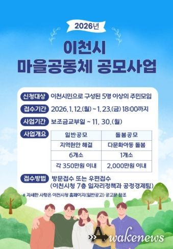 어웨이크뉴스 오경하 기자 | 이천시는 주민이 직접 제안하고 실행하는 공동체 활동을 지원하기 위해 ‘2026년 이천시 마을공동체 공모사업’ 참여 공동체를 모집한다고 밝혔다.
