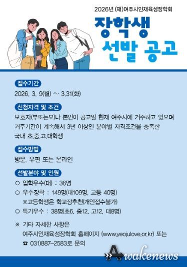 어웨이크뉴스 오경하 기자 | (재)여주시인재육성장학회는 ‘2026년 여주시인재육성장학회 장학생 선발공고’를 여주시인재육성장학회 홈페이지 및 여주시청 홈페이지에 게시했다