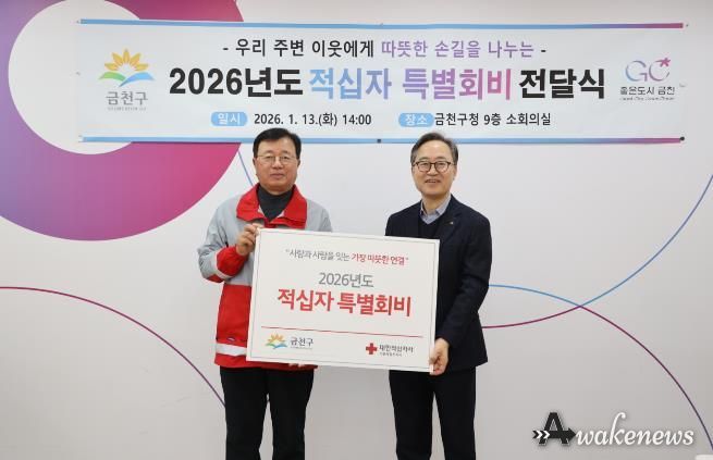 어웨이크뉴스 오경하 기자 | 금천구가 지난 13일 대한적십자사 서울지사에 2026년도 적십자 특별회비를 전달하며 나눔에 동참했다고 밝혔다.