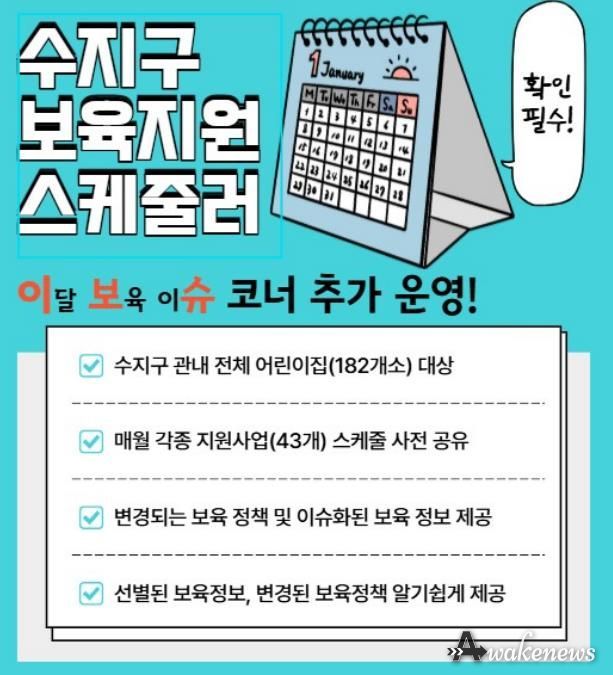 어웨이크뉴스 오경하 기자 | 용인특례시 수지구는 보육 정책 등을 알기 쉽게 정리한 ‘보육지원 스케줄러’에 이달 보육 이슈 항목을 신설했다고 15일 밝혔다.