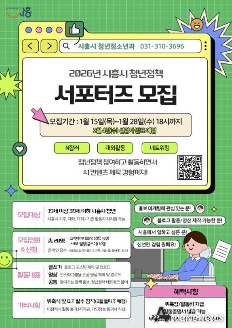 어웨이크뉴스 오경하 기자 | 시흥시는 청년의 눈높이에서 정책 정보를 전달하고 현장의 목소리를 시정에 반영하기 위해 ‘2026년 시흥시 청년정책 서포터즈’를 1월 15일부터 28일까지 모집한다.