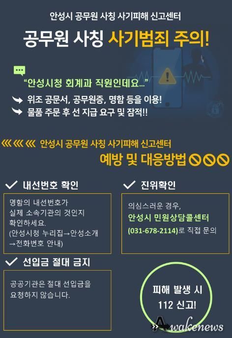 안성시 관계자는 “안성시 공무원은 어떠한 경우에도 선입금을 요구하지 않는다”며 “수상하거나 의심스러운 연락을 받았을 경우, 즉시 신고센터로 문의해 달라”고 당부했다.