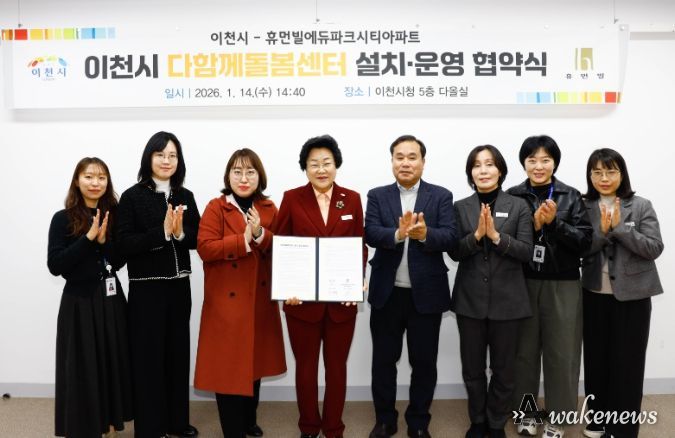 어웨이크뉴스 오경하 기자 | 이천시는 지난 14일 시청에서 휴먼빌에듀파크시티아파트와 단지 내 ‘다함께돌봄센터 설치·운영을 위한 업무 협약’을 체결했다고 밝혔다. 이날 협약식에는 이도아 입주자 대표회의 회장을 비롯한 관계자들이 참석했다.