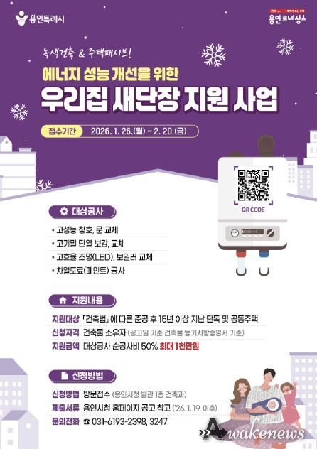 어웨이크뉴스 오경하 기자 | 용인특례시가 오는 26일부터 2월 20일까지 노후주택 에너지 효율 개선 지원 사업인 ‘우리집 새단장 지원사업’ 신청을 받는다고 16일 밝혔다.