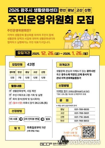 어웨이크뉴스 오경하 기자 | (재)광주시문화재단은 광주시 생활문화센터(만선·광남·고산·신현)에서 2026년에 활동할 주민운영위원회 위원을 통합 공개 모집한다고 밝혔다.