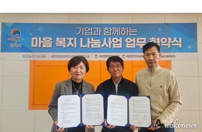 어웨이크뉴스 오경하 기자 | 평택시 서탄면은 지난 16일 칠성고분자(주), 서탄면 지역사회보장협의체와 함께 ‘기업과 함께하는 마을복지 나눔사업’추진을 위한 업무협약(MOU)을 체결했다.
