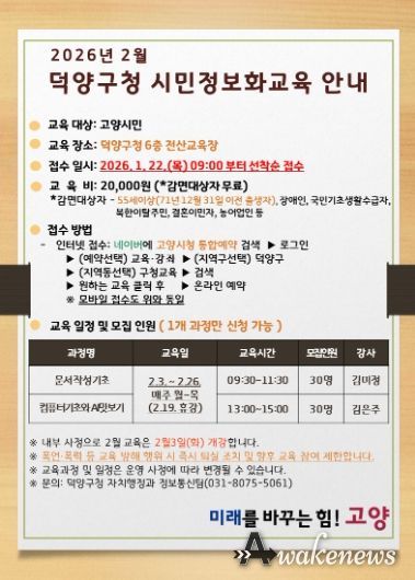 어웨이크뉴스 오경하 기자 | 고양특례시 덕양구는 고양시민의 디지털 역량 강화를 위해 ‘2026년 제1차 덕양구 시민정보화교육’ 수강생을 오는 22일부터 모집한다고 밝혔다.