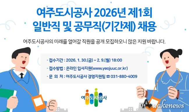 어웨이크뉴스 오경하 기자 | 여주도시공사는 공사의 지속 가능한 성장과 공공서비스 품질 향상을 위해 2026년 제1회 일반직 및 공무직, 기간제 직무중심 채용을 실시한다고 밝혔다.