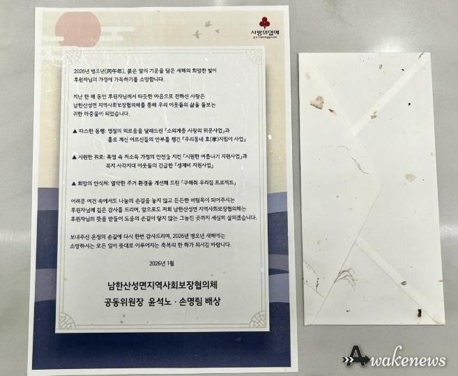 어웨이크뉴스 오경하 기자 | 광주시 남한산성면 지역사회보장협의체는 2026년 병오년(丙午年) 새해를 맞아 지난 한 해 동안 지역 내 어려운 이웃을 위해 나눔을 실천해 온 후원자들에게 감사의 마음을 담은 서한문을 발송했다고 21일 밝혔다.
