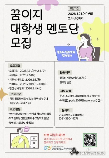 어웨이크뉴스 오경하 기자 | (재)군포시청소년재단 군포시진로교육협력센터는 관내 청소년의 진로 탐색과 진로 역량 강화를 위해 '2026년 군포시진로교육협력센터 교육기부자'를 모집한다고 밝혔다.