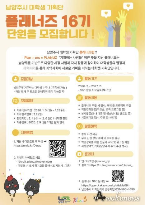 어웨이크뉴스 오경하 기자 | 남양주시는 관내 거주 대학생을 대상으로 남양주시 대학생 기획단 ‘플래너즈’ 16기 신규 단원을 28일까지 모집한다.