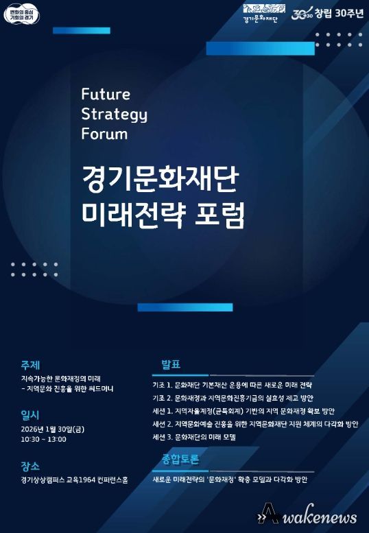 어웨이크뉴스 오경하 기자 | 경기문화재단(대표이사 유정주)은 창립 30주년(2027년)을 앞두고 재단의 미래 30년을 준비하기 위한 정책포럼으로 '경기문화재단 미래전략 포럼'을 오는 1월 30일, 경기상상캠퍼스 교육1964 컨퍼런스홀(수원)에서 개최한다.