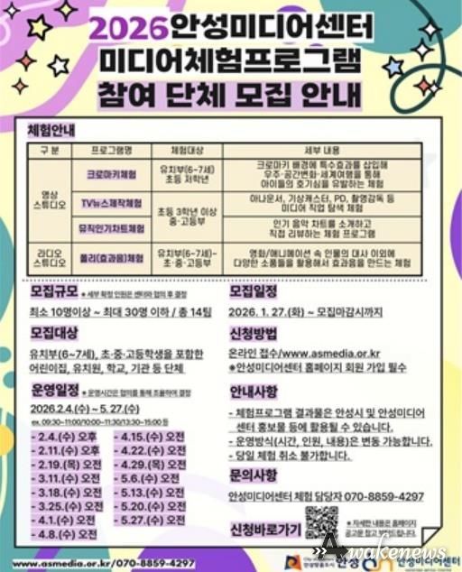 안성미디어센터 관계자는 “미디어체험은 아이들이 미디어를 가장 가까이에서 접하고 직접 표현해보는 중요한 과정”이라며 “올해는 더욱 체계적인 프로그램 운영과 다양한 콘텐츠로 지역 어린이와 청소년의 미디어 활용 역량을 높이겠다”고 말했다.