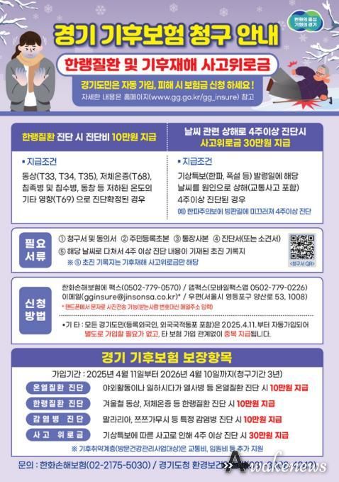 경기 기후보험은 폭염뿐 아니라 한파·폭설 등 겨울철 기후위험으로 발생한 한랭질환과 기후재해 사고에 대해 진단비와 위로금을 지원하는 제도로, 겨울철 일상 속 사고와 건강 피해까지 포괄적으로 보장한다.