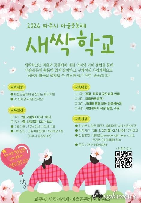 어웨이크뉴스 오경하 기자 | 파주시가 오는 2월 11일까지 주민들의 마을공동체 활동 입문을 돕는 녪파주시 마을공동체 새싹학교’교육생을 모집한다.