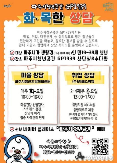 어웨이크뉴스 오경하 기자 | 파주시는 청년들의 심리 안정과 취업 역량 강화를 위해 파주시청년공간 지피(GP)1939에서 진행하는 상담 프로그램 ‘화·목한 상담’의 참여자를 모집한다.