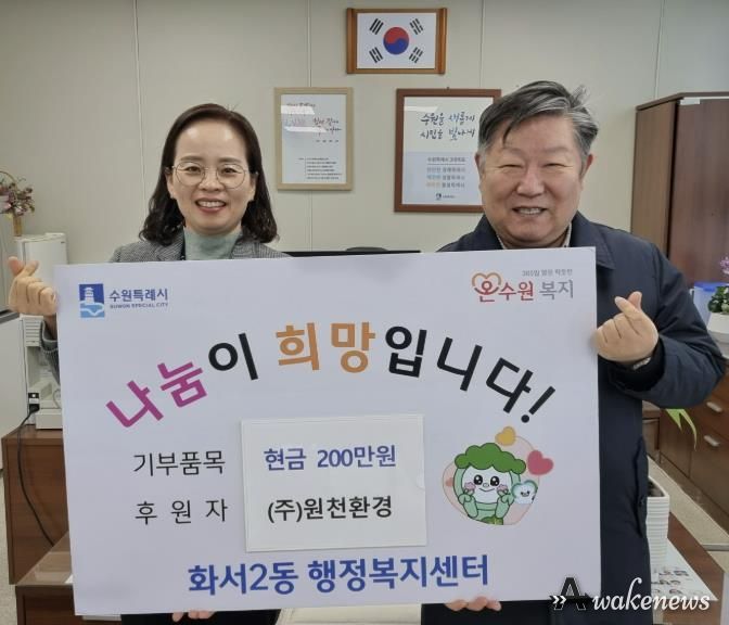 어웨이크뉴스 오경하 기자 | 수원시 팔달구 화서2동 행정복지센터는 최근 관내 폐기물 수거업체 원천환경이 어려운 이웃을 위해 사용해 달라며 이웃돕기 성금 200만 원을 기탁했다고 밝혔다.