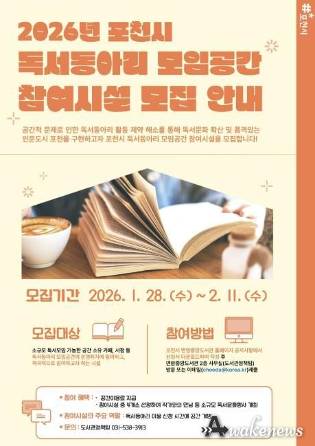 어웨이크뉴스 오경하 기자 | 포천시는 ‘2026년 독서동아리 모임공간 지원 사업’에 참여할 시설을 오는 2월 11일까지 모집한다.
