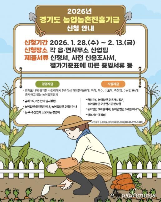 어웨이크뉴스 오경하 기자 | 양평군은 농어업인의 소득 향상과 삶의 질 개선, 경영 안정을 도모하고 농업 경쟁력을 강화하기 위해 2026년 경기도 농업농촌진흥기금 ‘경영 및 시설자금 지원’ 대상자를 모집한다고 밝혔다.