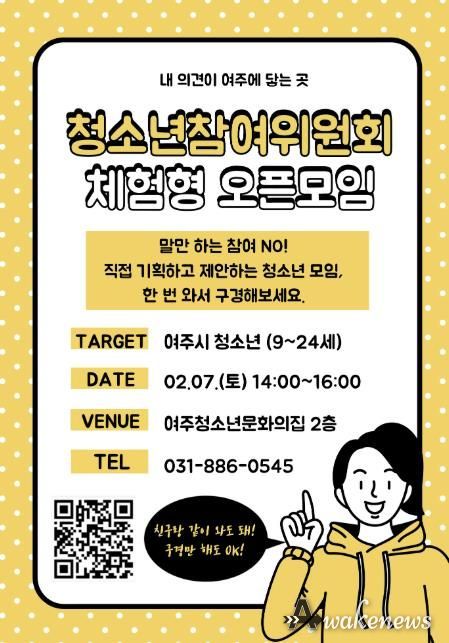 모집 대상은 여주시에 거주하거나 재학 중인 9세~24세 청소년이며, 모집 기간은 2월 18일까지이다. 선발된 위원들은 월 1회 정기회의 및 분과활동을 비롯해 정책 제안, 행사 기획, 청소년 사업 모니터링, 다른 지역 청소년참여위원회와의 교류 활동 등에 참여하게 된다.