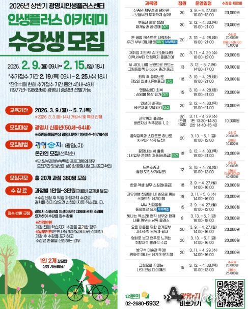어웨이크뉴스 오경하 기자 | 광명시 인생플러스센터는 신중년의 인생 2막 탐색과 준비를 지원하는 ‘2026년 상반기 인생플러스 아카데미’ 수강생 380명을 오는 9일부터 선착순 모집한다.
