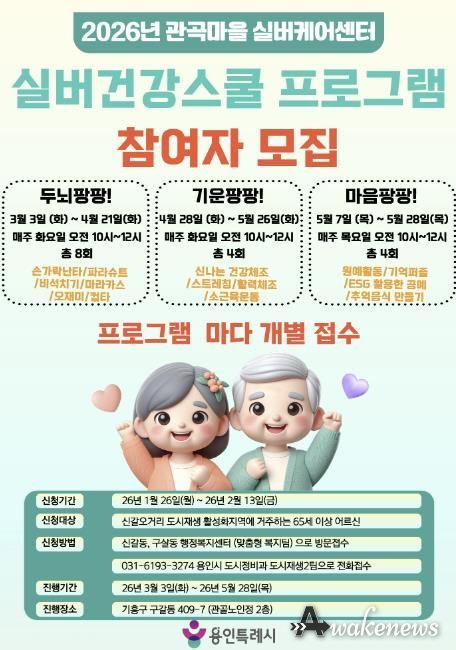 어웨이크뉴스 오경하 기자 | 용인특례시는 ‘관곡마을 실버케어센터 실버건강 프로그램’ 참가자를 13일까지 모집한다.