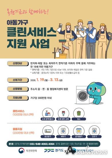 어웨이크뉴스 오경하 기자 | 경기도에서 열악한 주거환경에 거주하는 아동가구들을 위한 ‘아동가구 클린서비스 지원 사업’을 복권기금과 함께 추진한다.