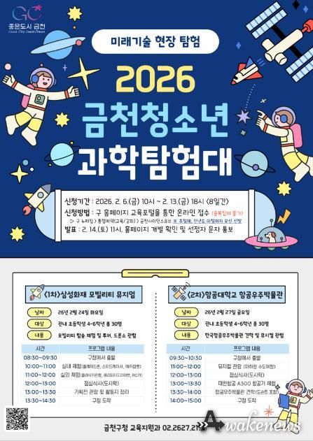 어웨이크뉴스 오경하 기자 | 금천구는 관내 초등학생을 대상으로 미래기술 현장을 직접 체험하는 ‘2026년 금천 청소년 과학탐험대’ 프로그램을 운영한다고 밝혔다.