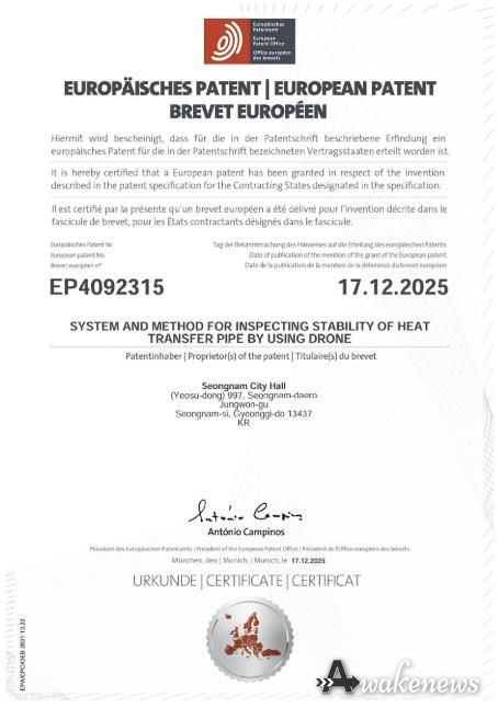 어웨이크뉴스 오경하 기자 | 성남시가 자체 개발한 ‘드론을 이용한 열수송관 안정성 검사 시스템’이 유럽특허(등록번호 EP4092315) 등록을 완료했다고 밝혔다. 이는 시 최초의 해외특허 등록 사례로, 지식재산의 해외 권리화를 통해 유럽 수출길을 여는 계기가 될 것으로 기대된다.