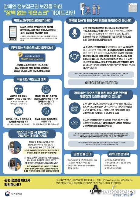 최근 개정된 ‘장애인차별금지 및 권리구제 등에 관한 법률’ 시행령에 따라, 공공과 민간에서 키오스크(무인정보단말기)를 설치·운영하는 경우 접근성 검증 기준을 충족하는 기기를 사용하고, 시각장애인을 위한 음성 안내 장치를 갖춰야 한다.