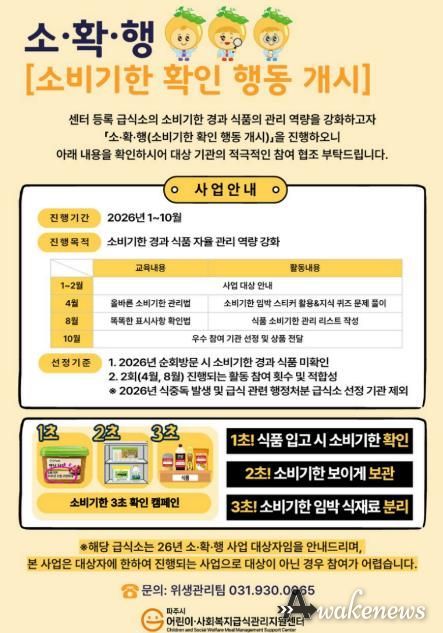 어웨이크뉴스 오경하 기자 | 파주시 위탁기관인 파주시 어린이·사회복지급식관리지원센터는 관내 급식소의 식재료 소비기한 자율 관리 역량 강화를 위해 1월부터 10월까지 ‘소·확·행(소비기한 확인 행동 개시)’사업을 추진한다.