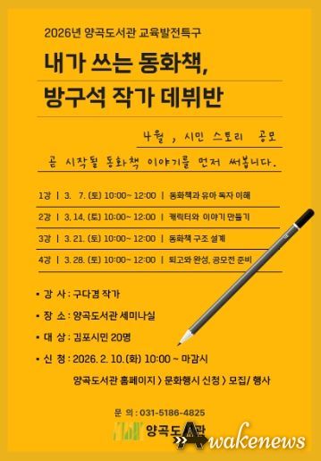 어웨이크뉴스 오경하 기자 | 김포시 양곡도서관은 오는 3월 7일부터 3월 28일까지 매주 토요일, 시민을 대상으로 한 그림책 글쓰기 수업 '내가 쓰는 동화책, 방구석 작가 데뷔반'을 운영한다.
