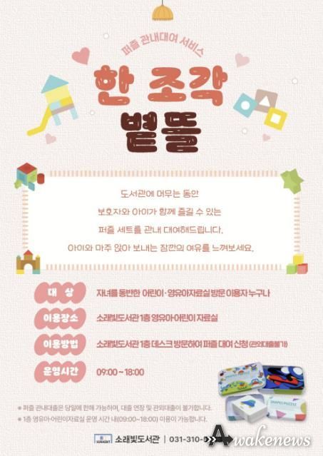 어웨이크뉴스 오경하 기자 | 시흥시 소래빛도서관은 어린이를 위한 관내 퍼즐 대여 서비스 ‘한 조각 볕뜰’을 새롭게 선보인다. 이 서비스는 빠른 영상과 즉각적인 자극에 익숙해진 아이들이 잠시 속도를 늦추고, 손끝 감각과 집중력을 자연스럽게 기를 수 있도록 마련됐다.