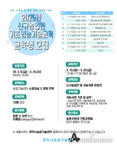 어웨이크뉴스 오경하 기자 | 양주시는 농촌지역으로 이주한 귀농․귀촌인과 예비 귀농인의 안정적인 농촌 정착을 지원하기 위해 ‘2026년 신규농업인 기초영농기술교육’ 교육생을 모집한다.