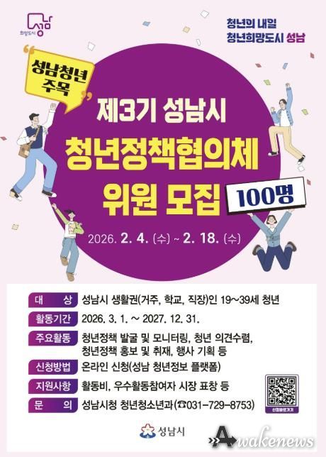 어웨이크뉴스 오경하 기자 | 성남시는 오는 2월 18일까지 ‘제3기 청년정책협의체’ 위원 100명을 공개 모집한다.