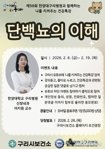 백경현 구리시장은 “단백뇨는 단순한 검사 결과로 넘기기보다 신장 건강을 점검하는 중요한 신호로 인식할 필요가 있다”라며 “이번 유튜브 건강특강을 통해 시민들이 자신의 건강 상태를 이해하고 예방 중심의 건강관리를 실천하는 계기가 되길 바란다”라고 말했다.