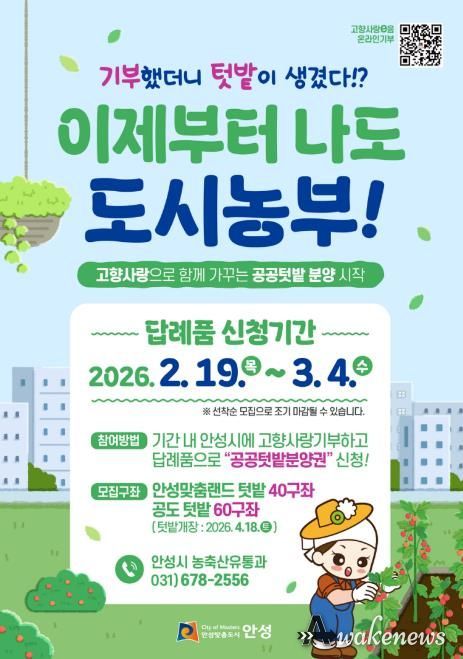 어웨이크뉴스 오경하 기자 | 안성시는 오는 2월 19일부터 고향사랑기부제를 통해 도시농업을 체험하는 ‘도시농부’를 모집한다고 밝혔다.
