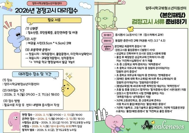 어웨이크뉴스 오경하 기자 | 양주시학교밖청소년지원센터에서는 학교 밖 청소년들을 위해 2026년 제1회 초중고 졸업 학력 검정고시 응시 원서 접수 대행을 지원한다.