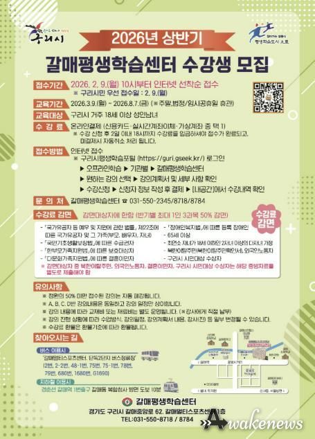 어웨이크뉴스 오경하 기자 | 구리시는 구리시평생학습관, 갈매평생학습센터, 수택평생학습센터에서 운영하는 2026년 상반기 평생학습 강좌의 수강생을 오는 2월 9일부터 모집한다고 밝혔다.