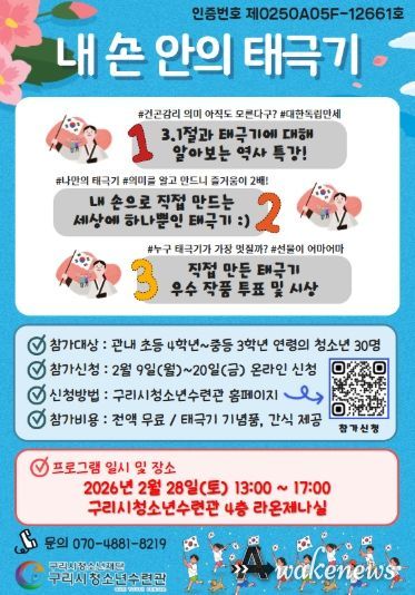 어웨이크뉴스 오경하 기자 | 구리시청소년재단 청소년수련관은 삼일절을 맞아 운영하는 ‘내 손 안의 태극기’ 인증 프로그램의 참가자 모집을 오는 2월 9일부터 시작한다고 밝혔다.