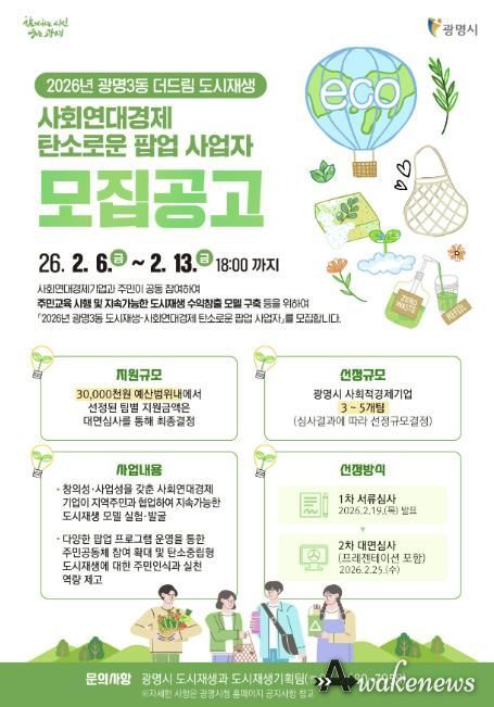 시는 오는 3월부터 12월까지 광명3동 더드림 도시재생사업의 일환인 ‘2026년 광명3동 도시재생-사회연대경제 탄소로운 팝업 사업’을 추진한다고 10일 밝혔다.