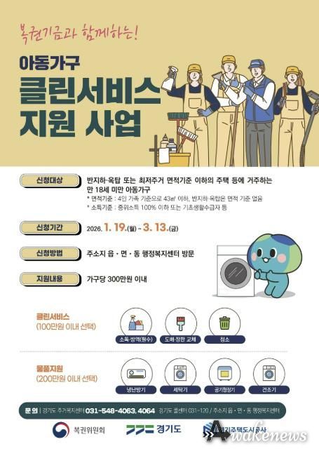 어웨이크뉴스 오경하 기자 | 성남시는 주거환경이 열악한 곳에 거주하는 아동의 주거환경과 위생 여건을 개선하기 위해 복권기금과 함께 추진하는 ‘아동가구 클린서비스 지원사업’의 대상 가구를 모집한다.