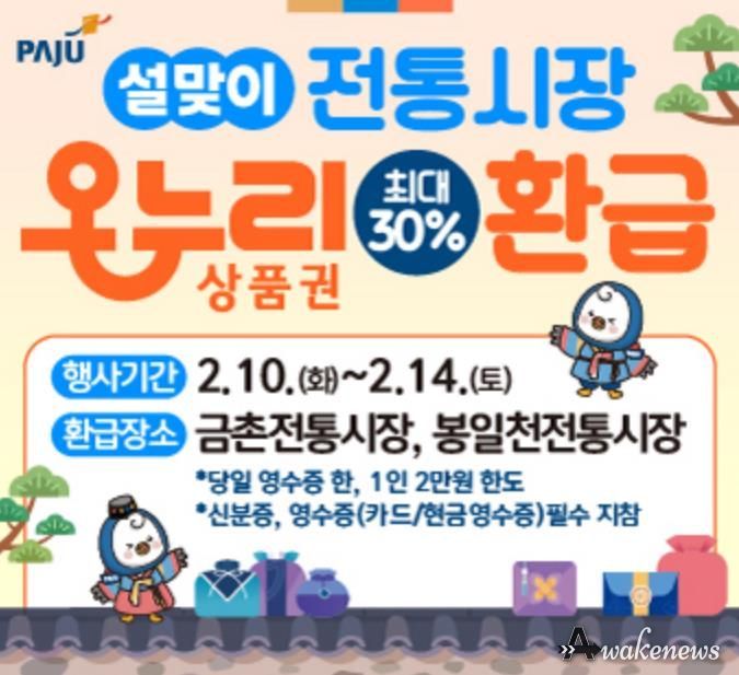 어웨이크뉴스 오경하 기자 | 파주시는 2026년 설 명절을 맞아 고물가로 인한 시민들의 가계 부담을 덜고 지역 전통시장 활성화를 도모하기 위해 ‘설맞이 농축산물 온누리상품권 환급 행사’를 실시한다.
