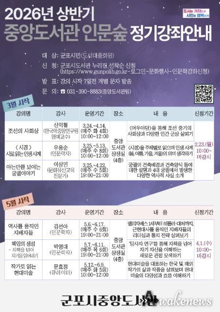 어웨이크뉴스 오경하 기자 | 군포시중앙도서관은 시민의 인문학적 소양을 함양하고 공동체적 성찰의 기회를 확대하고자 ‘중앙도서관 인문숲’ 상반기 강좌를 운영한다.