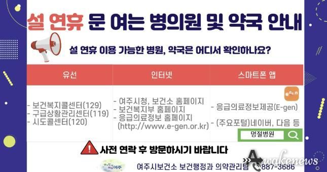 어웨이크뉴스 오경하 기자 | 여주시는 설 연휴 기간 동안 시민들이 의료 이용에 불편을 겪지 않도록 관내 문 여는 병·의원 및 약국 정보를 제공한다.